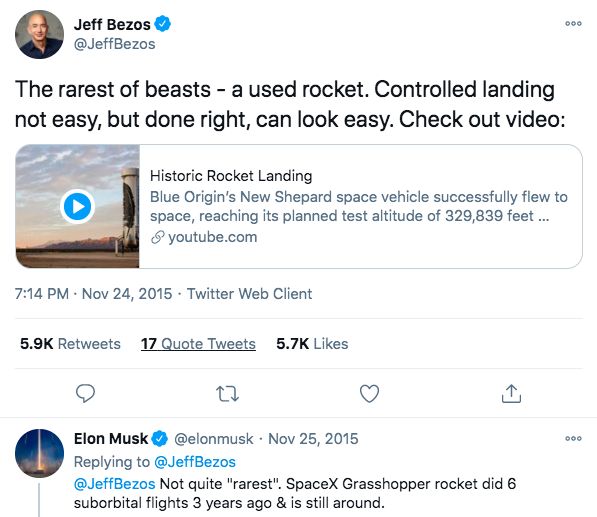 2015 年 11 月,贝佐斯加入 Twitter 写下了第一条推文,“最稀有的猛兽——一枚二手火箭”,并且加上了一条视频。视频里,亚轨道运载火箭“新谢泼德”号成功发射,然后垂直着陆,成为全球第一枚真正意义上飞入太空并且落地回收的火箭,因为新谢泼德号飞行高度 100 千米,刚好到达太空边缘。