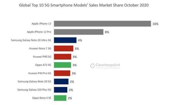 从销量看,这种当时非常成功的做法,在现在的手机市场一样有效。以OPPO Reno4 SE为例,这款被戏称为“iPhone 12表兄妹”的产品,不但成为线下爆款,更是在去年Counterpoint Research公布的10月份全球畅销5G手机名单中跻身前十,销量表现相当不错。