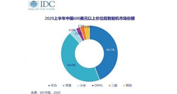 另一方面,近些年来,各家厂商都不再满足于推出中端走量/线上性价比产品,越来越多的高端旗舰手机开始涌现。根据IDC发布的2020上半年调查报告,国内高端手机市场几乎被华为与苹果平分,两者的市场份额分别为44.1%以及44.0%,占据着将近90%的高端市场。
