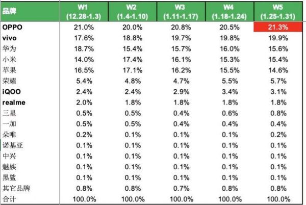 BCI的这份数据没有透露具体的销量数据,但对市场份额情况进行了详细的统计。可以看出,1月份的5周,OPPO、vivo、华为、小米和苹果五大品牌拿下了绝大部分市场份额,每周合计的市场占有率分别为: