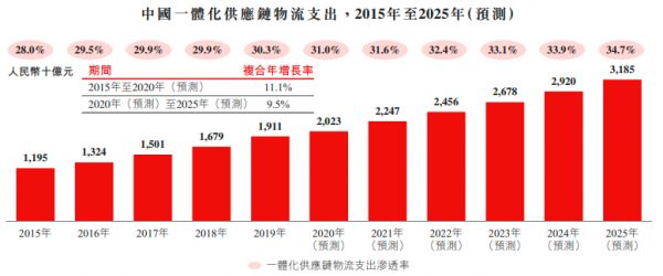 数据显示,2020年中国一体化供应链物流行业的市场规模将达到2万亿元,预计2025年增至3.2万亿元,渗透率从31%增至34.7%。而京东物流或将从中获益。