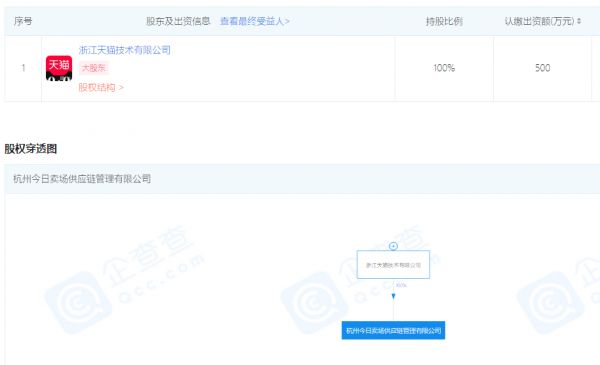 根据企查查企业股权穿透查询,发现公司控股股东是浙江天猫技术有限公司,注册资本500万,天猫100%控股。