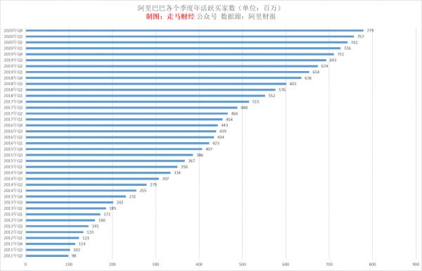截止到2020年四季度,阿里系电商的年活跃买家来到了7.79亿,离它的天花板一步之遥。