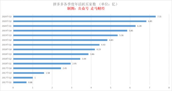 拼多多2020年三季度的年活跃买家数是7.31亿,四季度很有可能跟阿里差不多,7.8亿左右,离它的天花板还有两亿多呢。