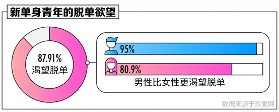 但不恋爱不等于不向往恋爱。在调研中有87.91%新单身青年渴望脱单坠入爱河,而且男性想恋爱的比例明显高于女性。