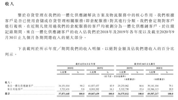 从营收构成来看,京东物流主要分为一体化供应链客户以及其他客户。京东物流会根据客户是否已使用仓储或存货管理相关服务(即仓配服务)对其进行分类,即对于近期凡使用过京东仓配服务的客户均被划分为一体化供应链客户。招股书显示,2018年、2019年以及2020年前9个月,来自一体化供应链客户的收入占总收入的绝大部分,分别为90.2%、83.9%和79.1%。