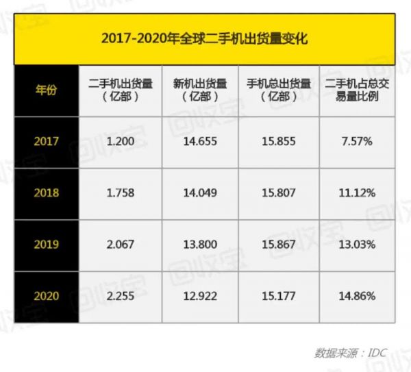 与新机出货量下滑相对应的,是二手手机开始受欢迎。IDC数据显示,在全球手机市场范围内,近四年的总出货量没有较大变化,二手机出货量却从2017年的1.2亿部增长到2020年时接近翻倍的2.255亿部,市场渗透率更是高达14.86%。