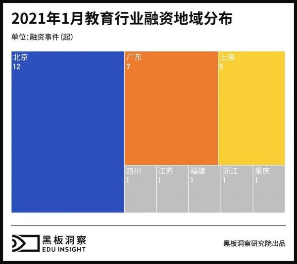 从地域分布上看,1月融资地域分布依旧以北京为主,占比高达41.38%。融资地域分布范围总和略多于12月。广东发生融资事件7起,上海5起,四川、福建、江苏、浙江、重庆各1起。本月“北上广深杭”中均有教育行业融资事件产生。