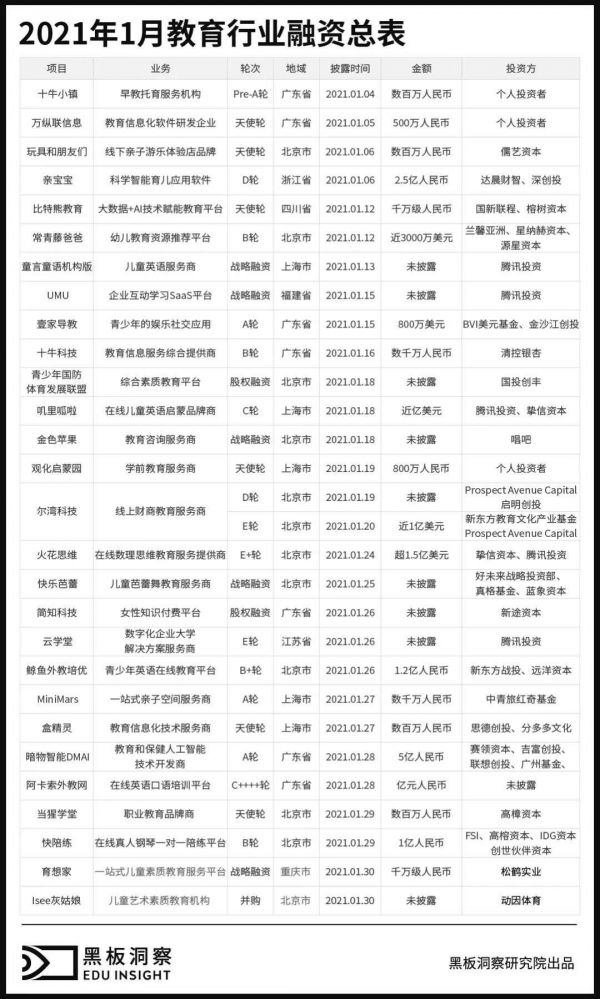 1月教育行业融资报告:28家企业共融资30.23亿元,腾讯投资最为活跃