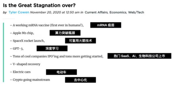 十年前出版《大停滞》一书的乔治梅森大学经济学教授泰勒·科文(Tyler Cowen)日前更新了他的观点:他在博客上转发了生物医药科技公司 Palantir 软件负责人Nabeel Qureshi的推文,依据如下图所示的疫苗、AI以及新能源等领域的显著变化,做出了“科技大停滞可能要结束了”的判断。