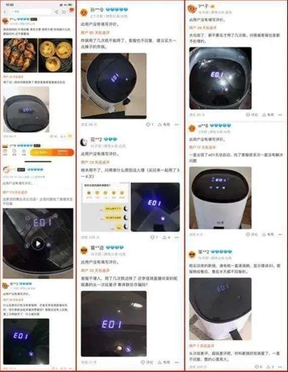 在天猫山本专卖店的链接下面,可以看到很多类似的投诉——用一段时间就故障了,控制面板显示E01,其他什么都点不动,联系客服直接没反应。这些用户大多通过李佳琦直播间“种草”这款空气炸锅。媒体曝光后,山本空气炸锅官方做出回复,认为控制面板本身没有质量问题,将对直播间买到问题产品的受众无偿退换货。