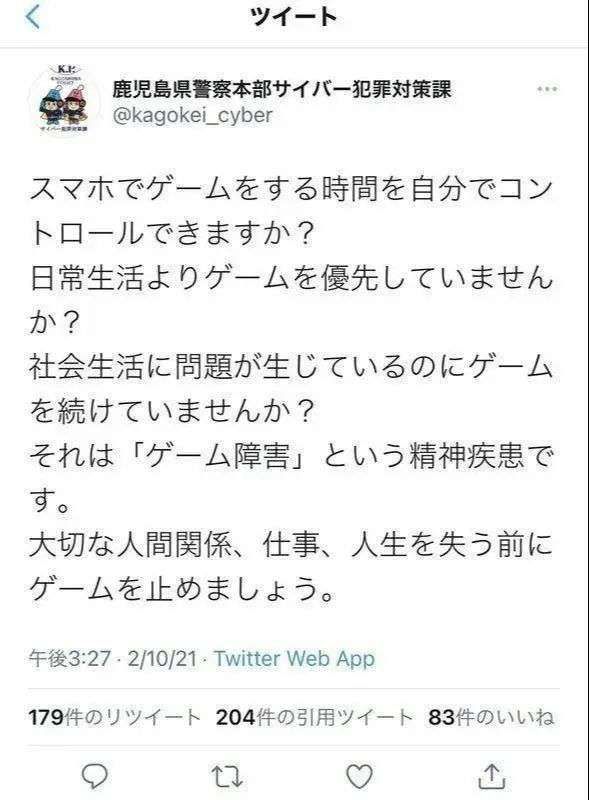 2021年2月10日,日本九州的鹿儿岛县警本部网络犯罪对策课对于当代玩家离不开游戏的“依存”现象发布推特:
