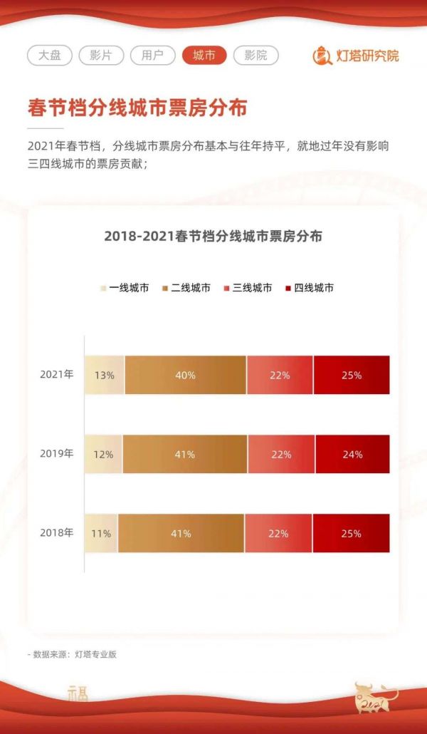 票价之外,另一个支撑票房上涨的因素是三四线城市消费者不减的观影热情。春节之前,多地对回乡层层加码,很多业内人士担心今年由于一线城市的“打工人”不能回到家乡,所以三四线城市的票房会受到影响。