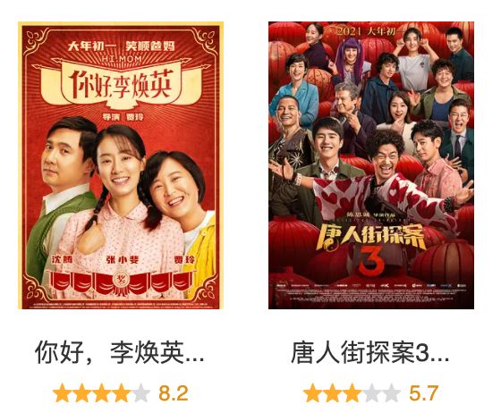 由于时隔一年才再次上映,加上前两部口碑不错积攒下来的不少粉丝,所以《唐探3》被更多影迷与影院经理认为是春节档最有卖相的影片。在最初的存量观众、活跃观众选择的影片票房爆发完毕后,影院经理就会选择被话题与口碑吸引的非活跃用户选择的影片,这个时候,原本很多观众没有太多预期但却口碑大爆的《李焕英》就被推了出来。