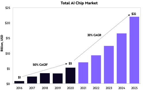 百度将要成立的AI芯片公司,未来的商业化前景也非常巨大。根据ARK的预测,未来5年AI芯片市场规模将从2020年的50亿美元增长4倍至220亿美元。