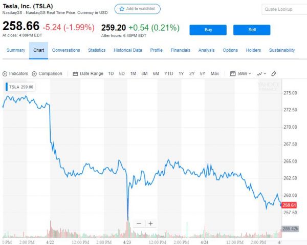 财报公布后,盘后特斯拉股价起初下挫,一度跌约3%,后反弹,涨幅曾达到1.9%,截至最近更新,涨幅收窄到0.4%以内。财报公布前,本周三特斯拉收跌约2%,收报258.66美元,收创去年10月11日以来新低,今年以来累跌超过16%。