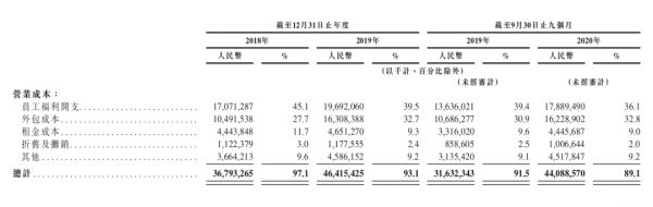 在京东物流的经营成本中,人力成本始终是大头,2020年前9个月占比43.1%。其次是占比32.7%的外包人员。