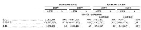随着收入规模的快速增长,京东在2018年、2019年及2020年前9个月毛利润分别为10.8亿、34.4亿及54.2亿元人民币,毛利率分别为2.9%、6.9%及10.9%。