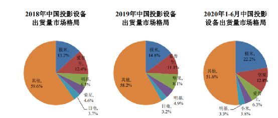 从市场占有率来看,极米科技已经连续三年稳坐市场头名的位置,有着更为明显的龙头优势。2020年上半年,中国投影设备市场总出货量累计达 169 万台,出货量前五大品牌分别为极米、坚果、爱普生、小米和明基,市场份额分别为 22.2%、12.8%、6.3%、3.8%和 3.3%。