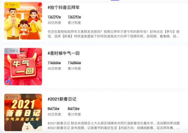 2021年的春节红包活动,抖音就比较侧重激活社交化以及直播业务。春节期间,抖音话题热榜前5均为过年相关话题。热榜第一的“云拜年”话题,就是试图改变用户在微信中复制粘贴然后群发拜年文案的现状,鼓励用户在抖音给好友拍摄拜年视频。