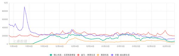 App的日下载量可以作为一个评判的标准。据七麦数据显示,橙心优选、盒马、美团优选和京喜三家App的从上线之初开始,日下载量呈现一个高开,后趋于平稳的态势,并从1月中旬开始略有下降,其中美团优选和橙心优选作为只包含社区团购服务的App,其日均下载量远低于更加综合的盒马和京喜。