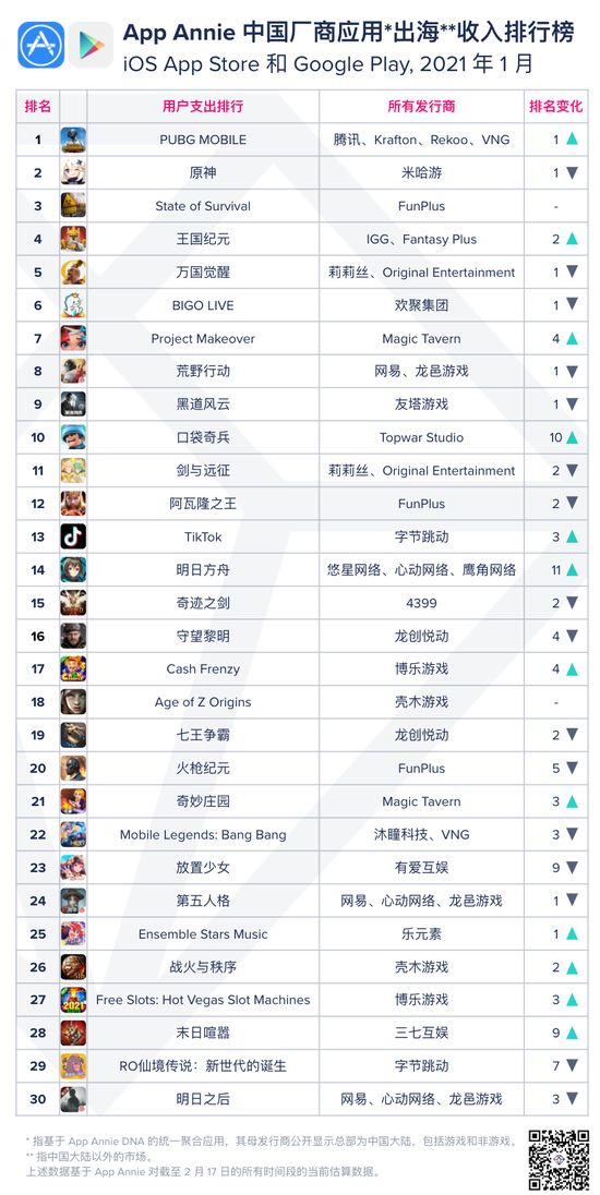 App Annie:1月中国厂商及应用出海收入榜:FunPlus第一腾讯第二
