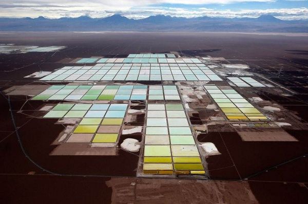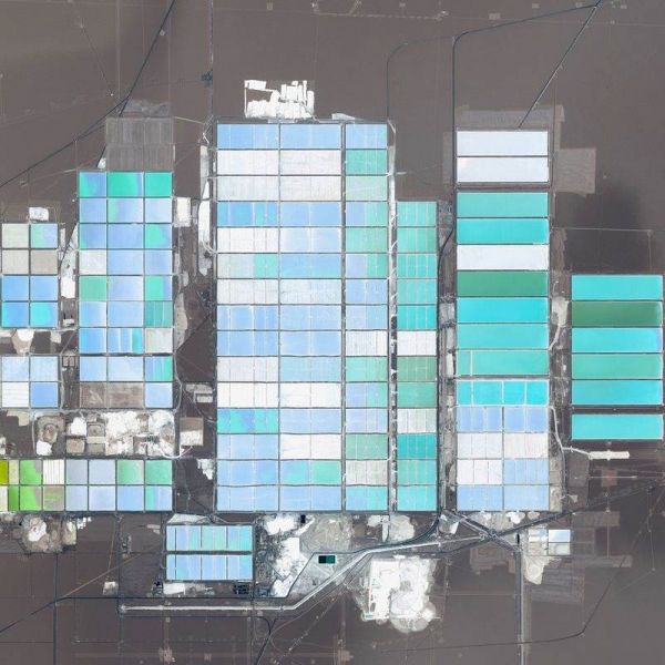 与葡萄牙不同的是,这里的锂矿是在盐水中发现的,所以采矿作业不会使用炸药和推土机,也不会留下难看的坑。相反,这里有一连串大型、整齐分离的蒸发池,里面装满了数百万公升的盐水。这些盐水都是从地表下抽出来的,置于盐水池中在烈日下蒸发。