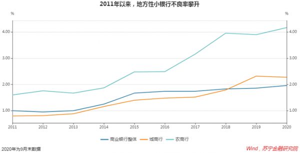 以农商行为例,截止2020年9月末,不良率高达4.17%,城商行也升至2.28%,均高于银行业平均水平。但鉴于各地经济发展的巨大差异,从个体层面看,地方银行之间表现出巨大的差异性:GDP增速乏力的地区,地方性银行多面临困境,表现为不良率高企;GDP继续高增长的地区,地方性银行依旧处于发展机遇期。