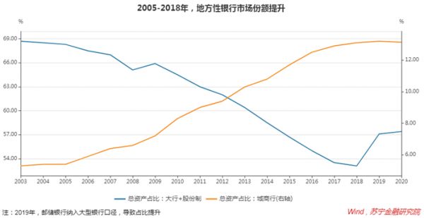 从数据上看,2005-2018年,大行+股份制银行的总资产占比从68.3%降至53.1%,同期,城商行占比从5.4%提升至13.1%,市场影响力日益凸显。