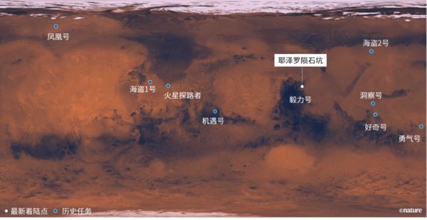 还有两项任务也在2月抵达了火星。阿联酋的“希望号”探测器在2月9日入轨火星,隔天中国“天问一号”也加入其中——这对阿联酋和中国来说都是第一次。但“毅力号”的目标是成为2012年以来首个登陆火星的火星车。2012年,NASA的“好奇号”(Curiosity)探测器降落在盖尔陨石坑(Gale Crater),这个陨石坑是一个干涸的湖床,距离耶泽罗约3700公里。(“天问一号”计划最早在5月让一台火星车降落,而“希望号”没有降落计划。)迄今为止,只有8台探测器成功降落在火星表面并开展工作(见“着陆”)。
