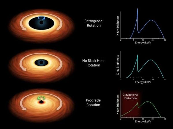 吸积盘气体温度为科学家们提供了一些线索。离黑洞越近的气体,温度会越高,甚至能达到几千万度,而它们的特性也会有所不同。借助X射线空间望远镜探测到这类细小的差别,科学家可以推断出它周边黑洞的转速。
