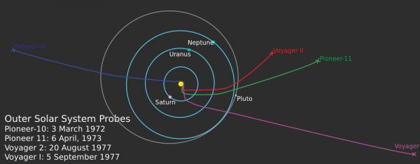 旅行者2号和旅行者1号分别于1977年8月20日和9月5日发射升空。这两个姊妹探测器沿着两条不同的轨道飞行,担负探测太阳系外围行星的任务。