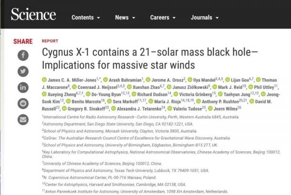 北京时间2月19日凌晨,三篇论文分别在国际顶级学术期刊《科学》(Science)和《天体物理学报》(Astrophysical Journal)上发表,来自于澳大利亚、美国和中国的科学家们联合发布了对黑洞X射线双星天鹅座X1(Cygnus X-1)的最新研究结果。