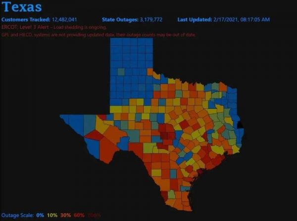 得州断电数据:蓝色停电率0%,黄色10%,橙色30%,红色60%,深红色100%。图:PowerOutage
