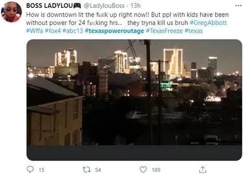 事实上,要说“得州所有地方”都被风雪冻成人间惨剧,倒也不是。至少,据美媒报道,居民区停电,但没什么人上班的市中心却“灯火璀璨”,老百姓吐槽连连。“我们都知道这条新闻,而且据我所知,海兰帕克(Highland Park)一带——百年前聚集了很多石油商人,现在是达拉斯富人区,前总统小布什退休后也定居此地——就一直没停电。所以现在推特上很多人就说要查一查为什么通电不公,然而我不认为最后能查出什么。”纪晓刚说。