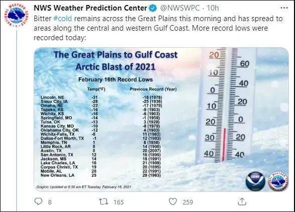 严寒除了带来停电和“嘴炮”,另有消息称,由于油井冻结,美国石油产量创纪录暴跌近40%。得克萨斯州卫生服务局说,该州各地的疫苗运输将被耽搁,未来是否重启将取决于天气状况——而根据美国国家气象局预报,下一轮暴风雪又将来袭,未来两天将先后波及美国南部、中西部和东北部多州……