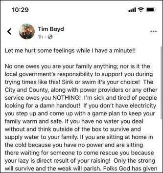 科罗拉多市的市长蒂姆·博伊德(Tim Boyd)索性不装了,在当地时间周二早上发布的一则网帖中,这位“坦率无忌”的市长放话:“我们不欠你和你的家庭什么,当地政府的责任不是在这种困难的时候给你们提供帮助!生存还是死亡是你们自己的选择!政府和电力供应商以及其他服务供应商并不欠你们什么!”博伊德还表示,没电没水的老百姓应该自己去想办法活下来,而不是“懒惰地伸手向政府要钱”,并称这种遇到困难就找政府要援助的行为是“社会主义政府的可悲产物”。“只有适者才能生存,弱者只会被淘汰。”