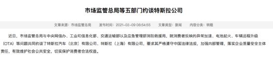 2月8日,中国国家市场监管总局官网发布消息称,该局与中央网信办、工业和信息化部、交通运输部以及应急管理部消防救援局,就消费者反映的异常加速、电池起火、车辆远程升级(OTA)等问题共同约谈了特斯拉汽车(北京)有限公司、特斯拉(上海)有限公司。