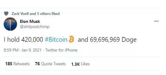 事实上,马斯克曾多次在推特上推崇比特币和其他加密货币。此前的1月10日,马斯克在评论《比特币亿万富翁》作者Ben Mezrich“自己再也不会拒绝接受比特币支付”的推文时表示,“我也不会拒绝。”