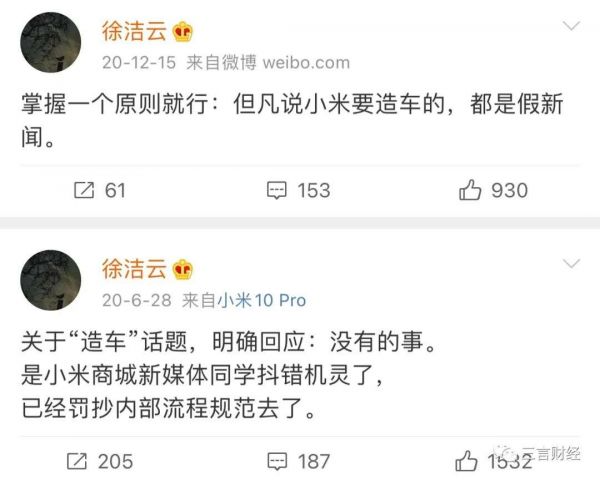 王化当时称,小米没有造车计划;徐洁云则连发两条微博否认造车,他表示“但凡说小米要造车的,都是假新闻”、“关于造车话题,明确回应:没有的事”。