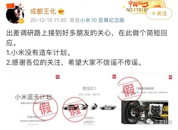 而有关小米造车传闻早已有之,2020年12月15日小米公关部副总经理王化以及小米集团总办副主任徐洁云曾辟谣,否认小米要造车。