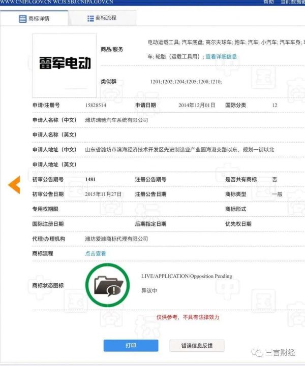 例如有人曾申请“雷军电动”商标。该商标申请日期为2014年12月1日,申请人系潍坊瑞驰汽车系统有限公司,商标状态为异议中。