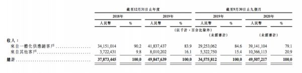 截止2020前三季度,一体化供应链客户和其他客户的收入占比为79.1%和20.9%。
