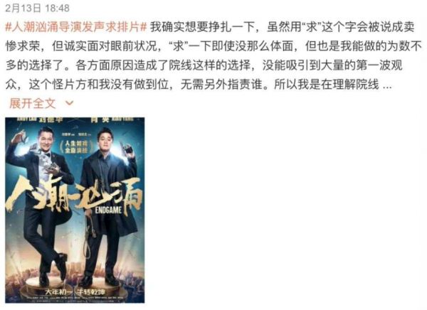 大年初二,《人潮汹涌》导演饶晓志开始在各路社交媒体上发声求排片,称自己已经尽最大努力,迫不得已“求”影院多一些排片。他将《人潮汹涌》与他上一部黑马片《无名之辈》作比,希望给《人潮汹涌》一点时间发酵、逆袭。