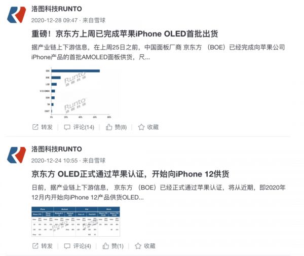 图片来源:雪球、洛图科技RUNTO事实上,早于2017年就有传言说京东方将为iPhone供应OLED屏幕,但由于技术和产量问题一直未能如愿。而京东方这次的正式加入,意味着原本由三星、LG主导的屏幕市场或将改变,不难想象,未来的OLED手机屏幕市场竞争也将因此变得更加剧烈。