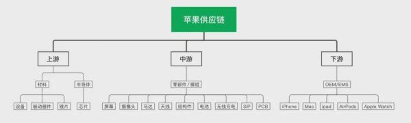 回顾整个苹果供应链,从类别上可以将其分为上、中、下游。