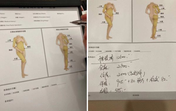 “如果做腰腹环吸减脂,手术是12600,加上全麻2800、住院2000、体检1065,以及术后需要穿的束身衣385,一共18850元”,上海时光整形顾问向GymSquare探访记者介绍减脂方案时表示,“但如果你愿意做案例的话,可以拿到15000的价格,今天定方案,后天就可以排手术”。