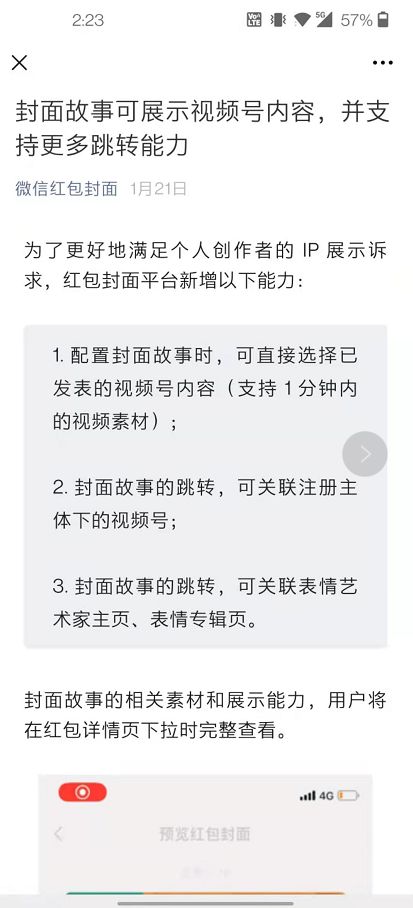 在微信8.0版本中,为了满足个人创作者的IP展示诉求,个人用户被允许选择已发表的视频号内容作为微信红包故事,而其他用户在打开微信红包之后也可以从封面故事跳转至注册主体旗下的视频号,并“可关联表情艺术家主页、表情专辑页”。