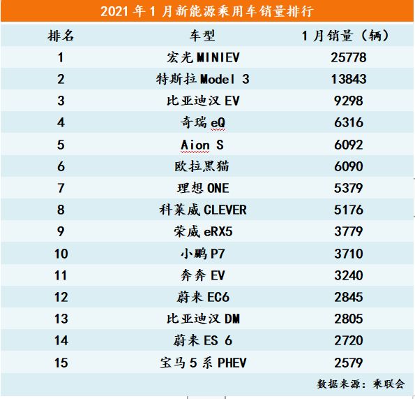 在乘联会发布的1月新能源车型销量前十排行榜中,10万元以下电动车占据4席,分别为宏光MINIEV、奇瑞eQ、欧拉黑猫和科莱威CLEVER,合计销量约为4.4万辆,占1月新能源乘用车销量的25.8%;另一方面,以特斯拉、比亚迪汉EV、理想ONE等为代表的中高端新能源车型也位居榜单前列。