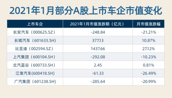 不过,1月A股市场中,比亚迪股价领涨除*ST众泰(000980.SZ)外的整车企业,涨幅为27.12%,市值增加了1437.66亿元;紧随其后的长城汽车(601633.SH)股价涨幅居于第二,市值增加377.13亿元;北汽蓝谷(600733.SH)股价微涨0.81%。